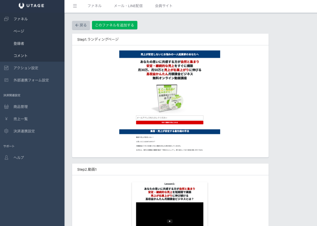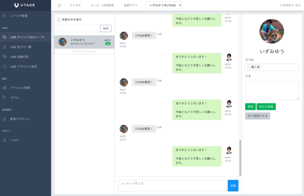 メール機能と同様に一斉配信、ステップ配信、リマインド配信ができ、LINEを通じた販売や購入後のフォローアップの自動化をすることができます。