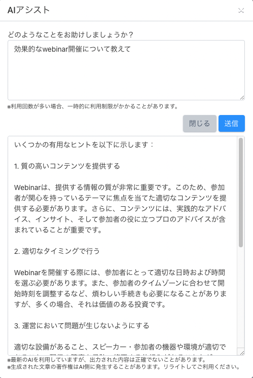 AIアシスト機能では具体的に以下のようなことを行うことができます。